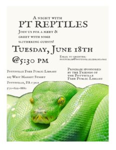 Join us for a meet and greet with some slithering guests! PT Reptiles will be back at the Pottsville Library on Tuesday, June 18th at 5:30. Please email to register: potpublib@pottsvillelibrary.org. This event is sponsored by the Friends of the Pottsville Free Public Library.