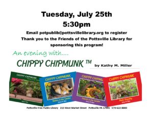 Join us for an evening with Chippy Chipmunk & author Kathy Miller. All ages welcome! Please register by emailing potpublib@pottsvillelibrary.org. Thank you to the Friends of the Library for sponsoring this program!