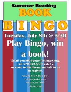 Join us for another Book Bingo Family Night, be sure to bring a bag for all the books you will be winning. To register please email potchild@pottsvillelibrary.org, call 570-622-8880 ext. 12 or come to the library and tell us you plan on coming.