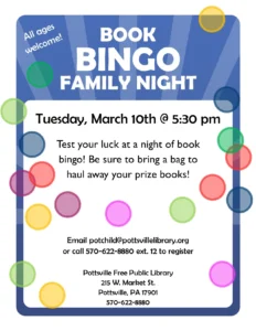 Come on down for another Book Bingo Family Night at the Pottsville Free Public Library on March 10th at 5:30 pm. Be sure to bring a bag for all the prize books you are sure to win. Please register by emailing potchild@pottsvillelibrary.org, calling 570-622-8880 ext. 12 or coming to the library and telling us in person.