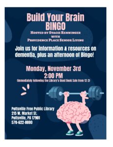 Stick around after the Library’s monthly used book sale for a game of Bingo hosted by Stacie Renninger from Providence Place Senior Living. Stacie will have information & resources on dementia, plus host a brain building bingo activity. Bingo is free to attend. Bingo will start on Monday, November 3rd at 2PM in the library basement.