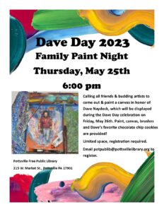Calling all friends and budding artists to come out & paint a canvas in honor of Dave Naydock! All canvases will be displayed during the Dave Day celebration of Friday, May 26th.