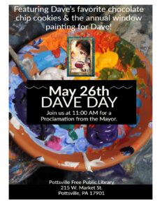 Join us on Friday, May 26th for our annual Dave Day celebration! There will be a proclamation from the Mayor of Pottsville at 11:00 AM. We will be serving Dave’s favorite chocolate chip cookies & have our annual window painting for Dave!