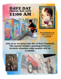 Join us on Friday, May 29th at 11AM for our yearly celebration of the life and artistic works of Dave Naydock! We will have the annual window painting for everyone to leave an artistic expression in honor of Dave, the display of works from budding artists from the family paint night, a proclamation from the Mayor of Pottsville, and Dave’s favorite chocolate chip cookies & other light refreshments.