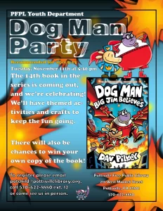 Join us at the Pottsville Free Public Library to celebrate the release of the 14th book in the Dog Man series. There will be Dog Man themed crafts and activities as well as a chance to win your own copy of the book. Recommended for ages 5-15. Registration appreciated, email potchild@pottsvillelibrary.org, call 570-622-8880 ext. 12 or come in and tell us in person.