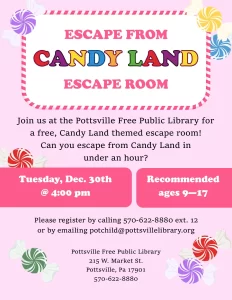 Join us at the Pottsville Free Public Library for a Candy Land themed escape room on Tuesday, December 30th at 4 pm. Recommended for ages 9-17. To register please email potchild@pottsvillelibrary.org, call 570-622-8880 ext. 12 or come visit us in person.