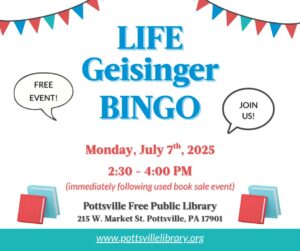 Join us after our monthly used book sale for a special FREE Bingo with Life Geisinger! Bingo starts at 2:30.