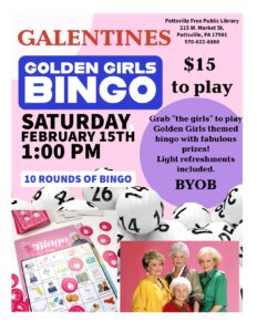 Grab “the girls” to play 10 rounds of Golden Girls themed bingo! Instead of numbers, you’ll be matching things like shady pines, Sophia’s purse & Stan’s traffic cone! Prizes will be awarded for each game. Light refreshments are included & this event is BYOB. Bingo will start at 1pm on Saturday, February 15th in the Library basement. $15 to play.