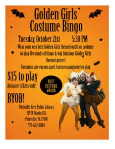 Join us for our first ever Golden Girls Costume Bingo! Wear your very best Golden Girls themed outfit or costume to play 10 rounds of Golden Girls themed bingo at the Pottsville Library! Prizes will be Golden Girls themed items, and there will be a prize for best costume! Costumes are encouraged, but not mandatory to play. Bingo will be on Tuesday, October 21st at 5:30 PM. Tickets are $15 & must be purchased in advance. Tickets are available at the Pottsville Library or can be purchased online through our Facebook event page using the Eventbrite link.