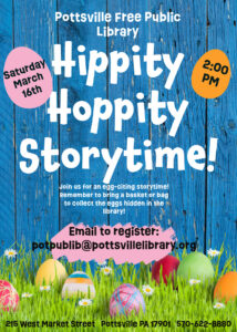 Join us for a very special Hippity Hoppity Storytime! Bring a basket or bag to search the Library for Easter Eggs after a story & craft. Storytime is Saturday, March 16th at 2PM. Please email to register with names & age of each child attending. Please pre-register so we make sure to have enough eggs for everyone!