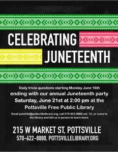 Join us at the Pottsville Free Public Library for our annual celebration of Juneteenth. Daily trivia questions will be at the library all week leading up to our annual party on Saturday June 21st at 2:00 pm. To register email potchild@pottsvillelibrary.org, call 570-622-8880 ext. 12 or come to the library and tell us you plan on coming.