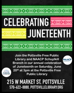 Join the NAACP Schuylkill Branch and the Pottsville Free Public Library at the Pottsville Free Public Library for our annual celebration of Juneteenth on Saturday, June 20th at 3 pm. Tell us your coming by emailing potchild@pottsvillelibrary.org, calling 570-622-8880 ext. 12 or telling us in person, registration not required but greatly appreciated.