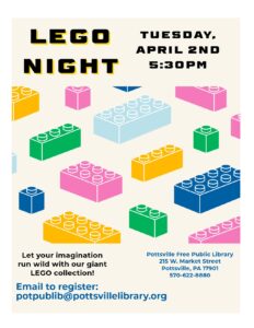 Let your imagination run wild with our giant LEGO collection! We will have sets that you can work on, or just use your imagination to build whatever you’d like! Legos will be available on Tuesday, March 19th at 5:30. Email to register: potpublib@pottsvillelibrary.org
