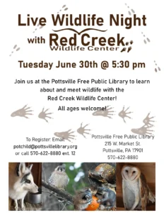 Join us at the Pottsville Free Public Library on Tuesday June 30th at 5:30 pm for a presentation by Red Creek Wildlife including live wildlife. Keep your Summer active with one of our Family Nights here for all ages. Registration encouraged but not required by emailing potchild@pottsvillelibrary.org, calling 570-622-8880 ext. 12 or coming to the library and telling us in person.