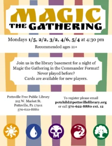 Come join us at the Pottsville Free Public Library for our monthly Magic the Gathering Night on Monday March 2nd at 4:30 pm where we will be playing in the commander format. Don’t know very much about Magic the Gathering but want to learn a little more, come in and we’ll take the time to introduce you to the rules and cards, which can then be used to play. To register email potchild@pottsvillelibrary.org, call 570-622-8880 ext. 12 or come and tell us in person. Recommended for ages 11 and up