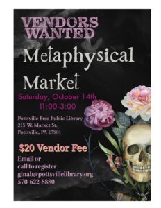Vendors should email ginab@pottsvillelibrary.org for a registration form. Vendor fee can be paid by using the Eventbrite link on our Facebook event page.