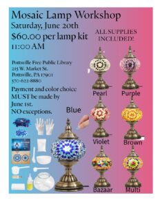 Back by even more popular demand–join us at the Pottsville Library for our Mosaic Lamp Workshop! Spend the day creating your very own masterpiece–each one looks different! You will be supplied with everything you need to make one beautiful 11 inch lamp. Patterns will be provided, but feel free to make your own whimsical design. You will have 7 gorgeous colors to choose from–please see photo for color choices!