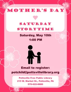 Join us for a Saturday Storytime celebrating moms. A story, songs and a craft. Recommended for ages 1-7. Register by emailing potchild@pottsvillelibrary.org, call (570) 622-8880 ext. 12 or come to the library and tell us in person to register.