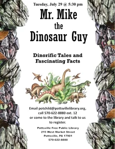 Come to the Pottsville Free Public Library as we are joined by Mr. Mike the Dinosaur Guy for a program celebrating Dinosaurs. Email potchild@pottsvillelibrary.org, call 570-622-8880 ext. 12 or come to the library and tell us you plan on coming.