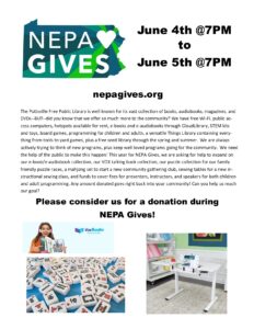 Please visit www.nepagives.org on Thursday, June 4th through Friday, June 5th from 7PM to 7PM to make your donation to the Pottsville Library! This 24 hour giving period helps nonprofit organizations all around Schuylkill County, including the Pottsville Library. Visit our donation page on nepagives.org to learn more about the Library & what your donation will go towards!