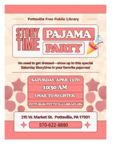 Don’t bother getting dressed on this sleepy Saturday morning–show up in your favorite pajamas for a special Saturday Storytime! Recommended for children 10 and under. Saturday, April 13th @ 10:30AM. Email to register: potpublib@pottsvillelibrary.org