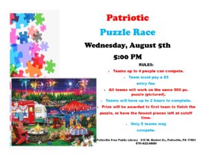 Get ready for some competitive family fun! Teams up to 4 people are invited to join us in racing to the finish line to complete the Patriotic 500 piece puzzle! Winning team will win a prize. Teams must pay an entry fee of $5 per TEAM (not per person). Puzzle Race will be held on Wednesday, August 5th, at 5:00 PM.