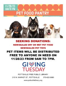 Now seeking donations for our Giving Tuesday event! This year we will be helping our pet parents provide for their furry friends. Donate new/sealed dry or wet pet food or new/sealed pet toys–they will be distributed to the community for free for anyone in need on Tuesday, November 28th from 9am to 7pm. No income requirements or ID needed–this is for everyone in the community.