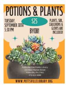 Enjoy an enchanting evening where your cauldron will be bubbling over–with succulents! Potions & Plants is a witchy themed arrangement of succulents planted in a cauldron. We will have other small decorations for your final creation, but feel free to bring anything you would like to add as well! Succulents, soil, cauldron & gloves are included in price. Potions & Plants will be held on Tuesday, September 30th at 5:30PM. Prepaid registration is due by September 15th. Tickets are $25. This is a BYOB event.