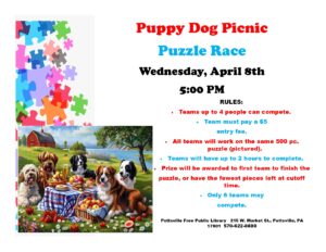 Get ready for some competitive family fun! Teams up to 4 people are invited to join us in racing to the finish line to complete the Puppy Dog Picnic 500 piece puzzle! Winning team will win a prize. Teams must pay an entry fee of $5 per TEAM (not per person). Puzzle Race will be held on Wednesday, April 8th