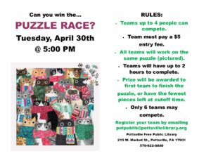 Do you have what it takes to win our Puzzle Race? Register your team now to compete! Puzzle Race will begin at 5:00PM on Tuesday, April 30th. Register your team by emailing potpublib@pottsvillelibrary.org