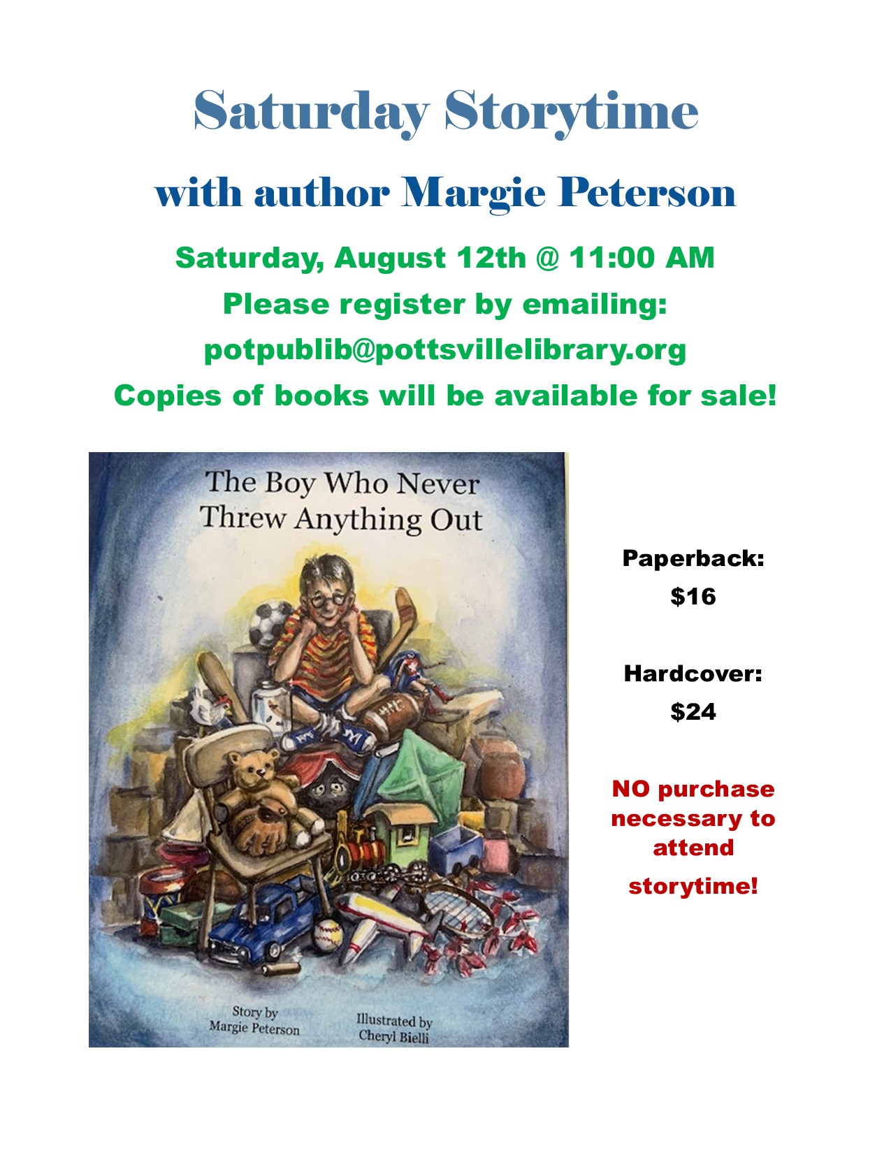 Join us for a special Saturday Storytime led by author Margie Peterson. She will be reading her book The Boy Who Never Threw Anything Out, and she will have copies available for sale. NO purchase is necessary to attend the Storytime. Please register by emailing potpublib@pottsvillelibrary.org with how many children will be attending.