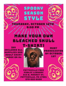 Come out on Thursday, October 12th @5:30 to bleach your own skull t-shirt & get your Halloween style on! All supplies included–gloves, bleach, adult sized t-shirts (Large and XL will be available. If you need a different size, please contact us.) $25 pre-paid registration is due by October 1st. Wear old clothes!!