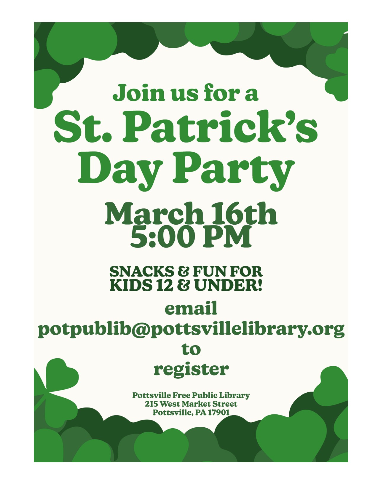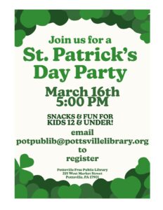 Join us for our St. Patrick’s Day party for kids 12 and under! There will be snacks, crafts & fun. Email with names of children attending and their ages to potpublib@pottsvillelibrary.org to register for the party.