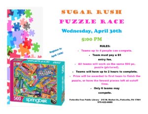 Do you love doing jigsaw puzzles? Get together a team of up to 4 people to compete in the Sugar Rush Puzzle Race at the Pottsville Free Public Library on Wednesday, April 30th! Up to six teams will try to complete the same 500-piece puzzle in two hours or less. A prize will be awarded to the first team to complete the puzzle, or the team that has the fewest pieces left after the allotted time. Contact the Circulation Desk by April 16th to sign up, either by coming in to the Library or calling 570-622-8880 x10. There is a $5 fee per team to take part.