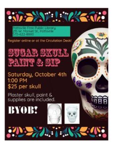 Enjoy a spooky Saturday by painting your very own plaster Sugar Skull at the Pottsville Library! You can BYOB and/or snacks to enjoy while you paint! Plaster skull, paint & painting supplies are included. Feel free to bring glitter or add ons if you want something special added to your creation! Program starts at 1:00 PM. $25 per ticket, limited seating.