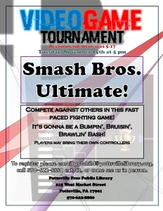 Join us at the Pottsville Free Public Library for a Super Smash Brother Ultimate tournament in celebration of International Games Month on Tuesday, November 25th at 5 pm. Recommended for ages 5-17, but as always younger and older siblings are welcome. Registration recommended by emailing potchild@pottsvillelibrary.org, calling 570-622-8880 ext. 12. or coming to the library and telling us in person.