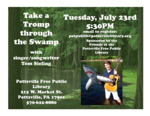 Join us on Tuesday, July 23rd at 5:30PM for a Tromp Through the Swamp with singer/songwriter Tom Sieling. This is a free, family friendly, all ages event. Please register by emailing potpublib@pottsvillelibrary.org with how many adults/children are in your party.