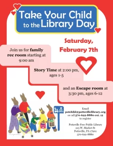 Join us at the Pottsville Free Public Library for Take Your Child to the Library Day on Saturday February 7th. Join us for Family Rec Room in the library basement from 9-noon for all ages, a story time at 2pm for ages 1-5 and an escape room at 3:30pm for ages 6-12. To register please email potchild@pottsvillelibrary.org, call 570-622-8880 ext. 12 or come visit the library and tell us in person.