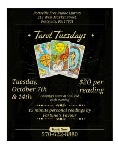 What do the cards have in store for you? Find out at the Pottsville Library while 2 expert tarot readers from Fortune’s Favour give you a personal 15 minute reading. Bookings start at 5:00pm on Tuesday, October 7th, and Tuesday, October 14th. Time slots fill up fast–don’t wait to schedule your personal tarot card reading! Each reading is $20. Book online via our Facebook page, or call 570-622-8880 ext. 10 to set up your time!