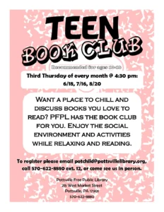 Looking for a place to read a book and chill with your peers then join us at the Pottsville Free Public Library for our teen book club. Recommended for ages 10-16. Summer is here again, keep up with your reading, bring your own book or use one of the ones we have here. We meet the third Thursday of the month, which for the summer is June 18th, July 16th and August 20th. Tell us your coming by emailing potchild@pottsvillelibrary.org, call 570-622-8880 ext. 12 or come to the library and tell us in person.