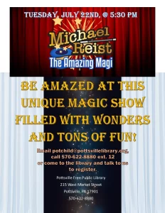 Come to the Pottsville Free Public Library as we are joined by the Amazing Magi for a spectacular magic show. To register email potchild@pottsvillelibrary.org, call 570-622-8880 ext. 12 or come to the library and tell us you plan on coming.