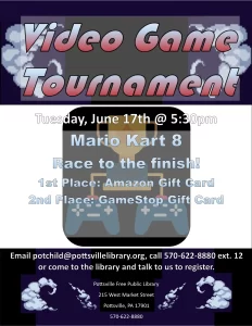 Join us for our first Family Night of Summer Reading Club, a family video game night, including a Mario Kart 8 tournament, first place gets an Amazon gift card and second place gets a GameStop gift card. Register by emailing potchild@pottsvillelibrary.org, call 570-622-8880 ext. 12 or come to the library and tell us in person.
