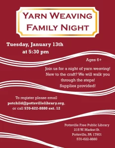 Join us at the Pottsville Free Public Library for a night of yarn weaving for ages 6+ on Tuesday, January 13th at 5:30. All materials will be provided. To register please email potchild@pottsvillelibrary.org, call 570-622-8880 ext. 12 or come visit us at the library and tell us in person.