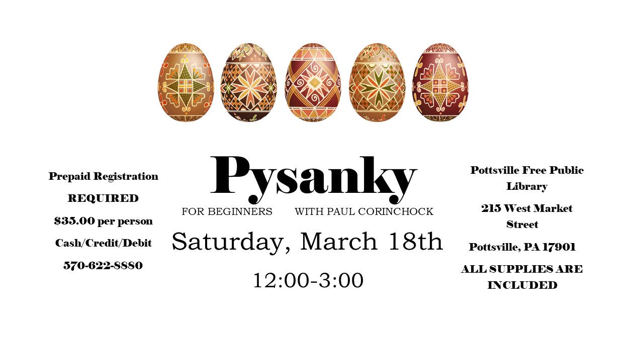 Join us for a beginner's level class on the beautiful art of Pysanky! Paul Corinchock will take you step by step to creating your own beautifully crafted egg. Supplies are included in class price. Saturday, March 18th from 12-3PM. Prepaid registrations are required. Class is $35 per person. Contact 570-622-8880 to reserve your spot, or […]