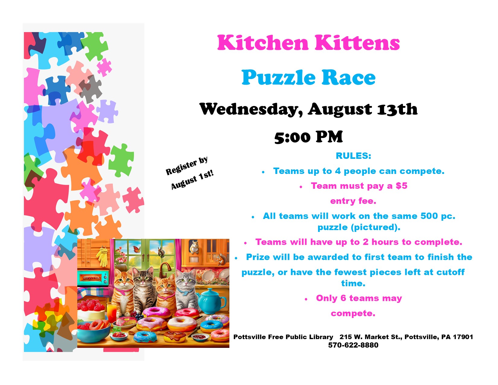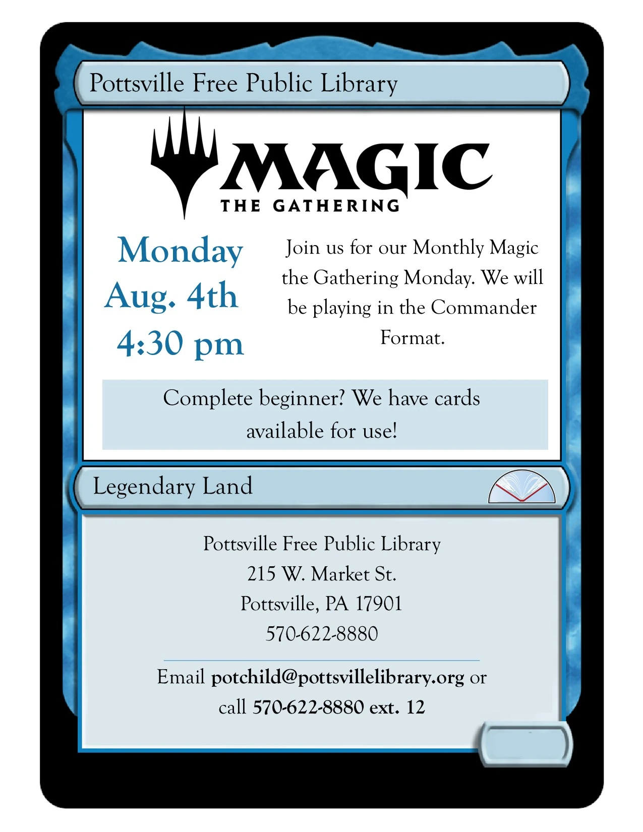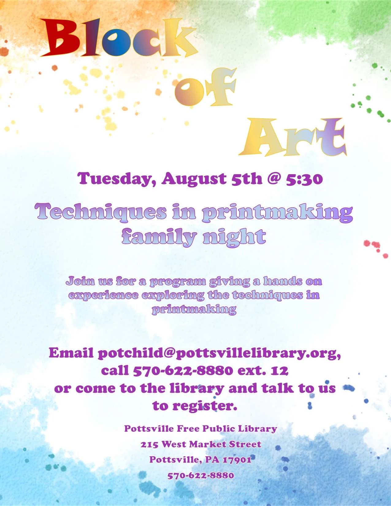 Join us for a story, songs and a craft for our Summer Storytimes on Mondays at 10:30 am running from June 16th until August 4th. Recommended for ages 1-5, older and younger siblings are always welcome. Register by emailing potchild@pottsvillelibrary.org, calling 570-622-8880 ext. 12 or coming in and telling us in person.