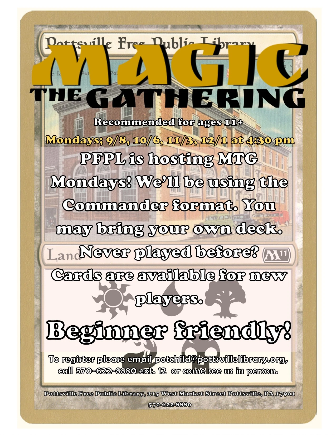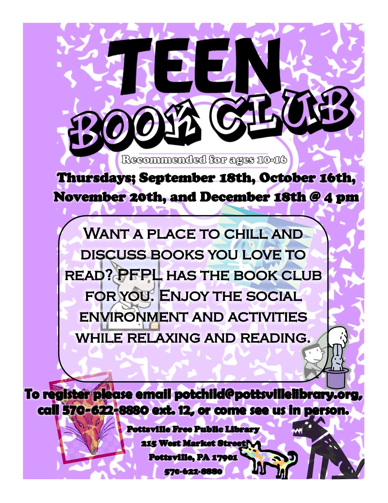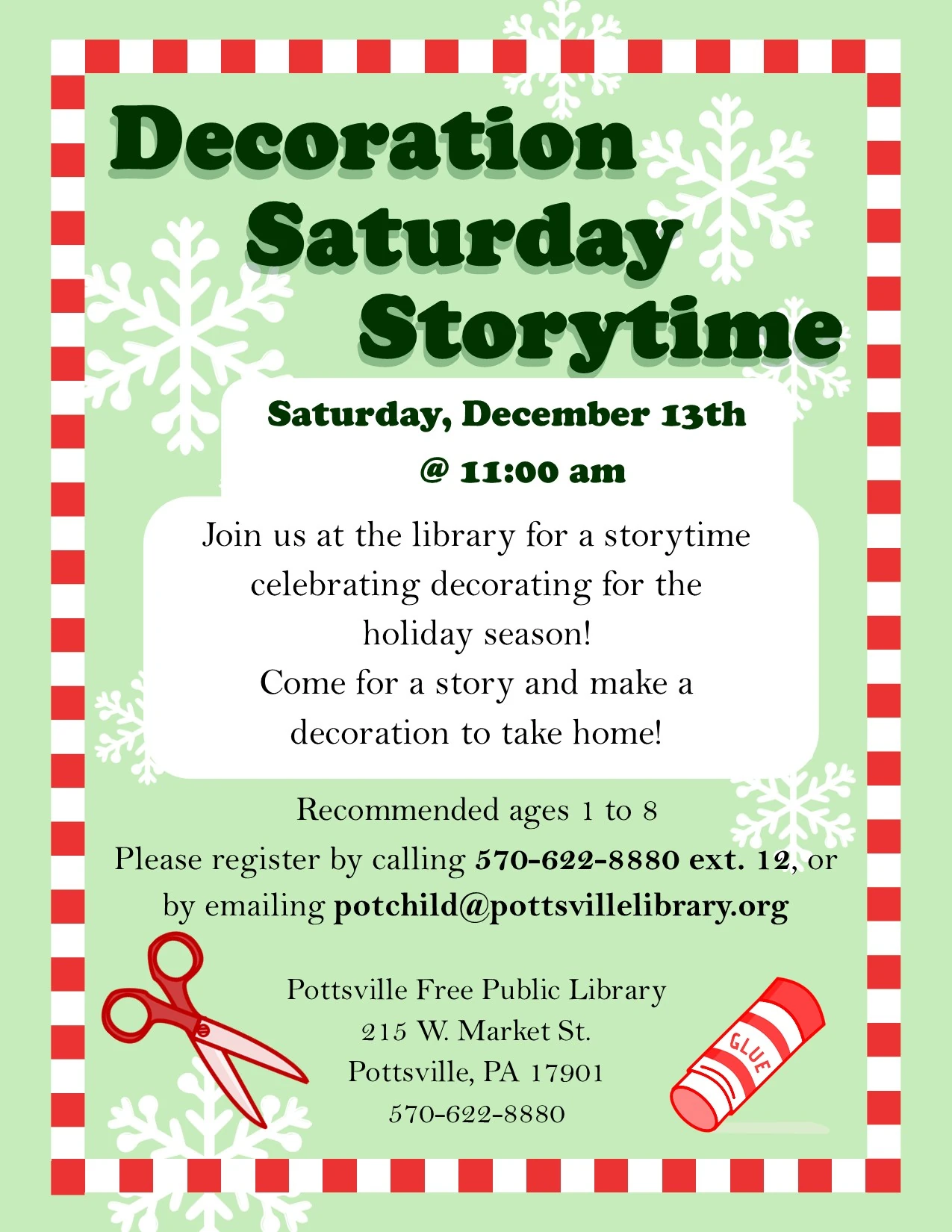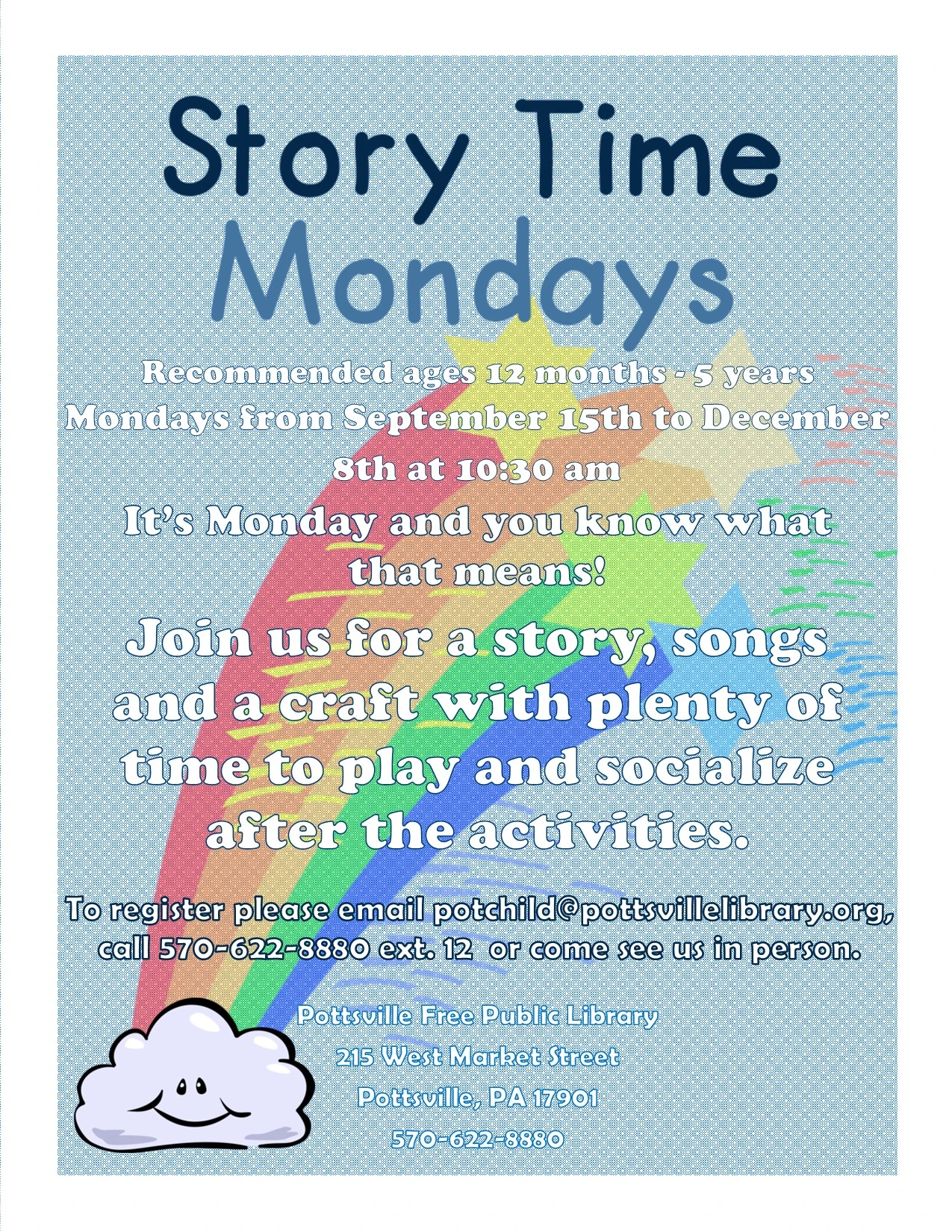 Join us for a story, songs and a craft for our Fall Story Times on Mondays at 10:30 am running from September 15th until December 8th. Recommended for ages 1-5, older and younger siblings are always welcome. Register by emailing potchild@pottsvillelibrary.org, calling 570-622-8880 ext. 12 or coming in and telling us in person.