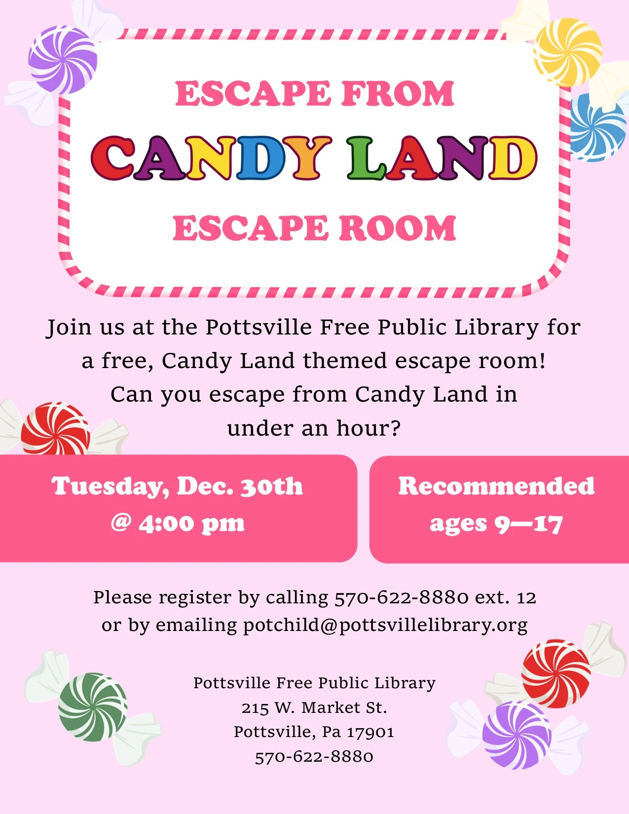 Join us at the Pottsville Free Public Library for a Candy Land themed escape room on Tuesday, December 30th at 4 pm. Recommended for ages 9-17. To register please email potchild@pottsvillelibrary.org, call 570-622-8880 ext. 12 or come visit us in person.