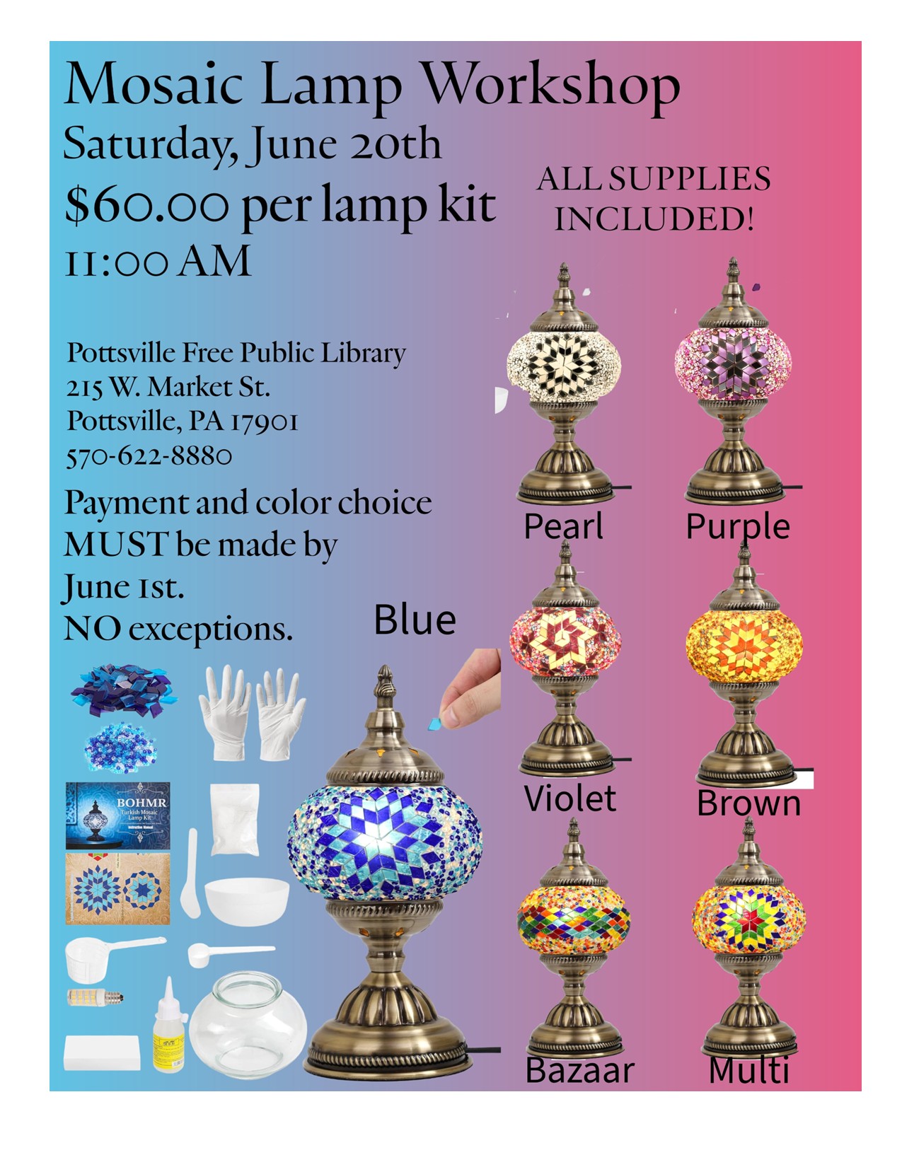 Back by even more popular demand–join us at the Pottsville Library for our Mosaic Lamp Workshop! Spend the day creating your very own masterpiece–each one looks different! You will be supplied with everything you need to make one beautiful 11 inch lamp. Patterns will be provided, but feel free to make your own whimsical design. […] |