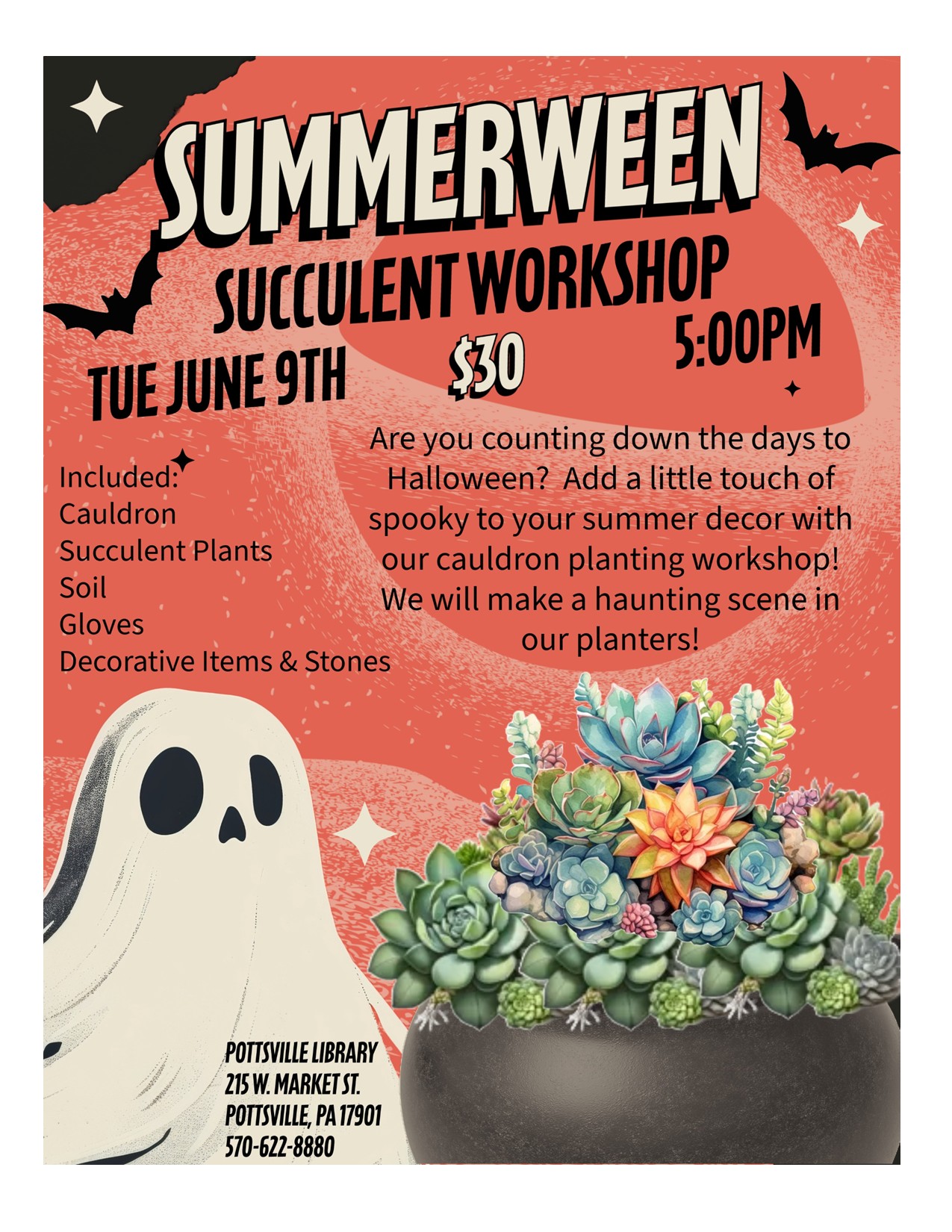 Are you counting down the days until Halloween? Are you more ghouly than girly? This is the program for you! In our Summerween Succulent Workshop we will first be creating a decorative haunted house as the centerpiece for our cauldron. Once completed, we will plant a succulent garden surrounding the haunted house. All supplies including […] |