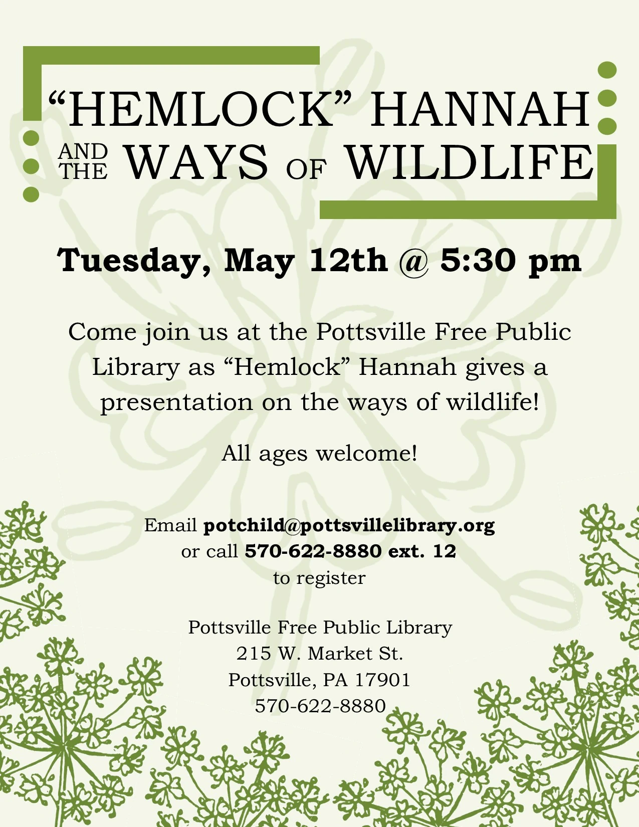 Come and join us on Tuesday, May 12th at 5:30 pm for a presentation from "Hemlock" Hannah on the ways of wildlife. All ages are welcome. Registration encouraged by emailing potchild@pottsvillelibrary.org, calling 570-622-8880 ext. 12 or coming to the library and telling us in person.